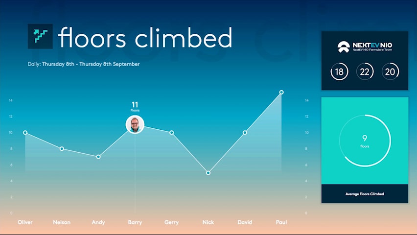At Interstate a lot of my coworkers had the pleasure of working close with the Nio Formula E team which meant that they’re always on their feet; the fitness dashboard was an idea to compare and contrast each of the team’s stats throughout the Formula-E season and display the almost real time data on their office information displays.